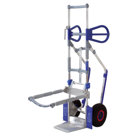 Stapelkarre mit Ohrengriffe, Schaufel Standard LxB 245x220mm, bei der Ausführung mit Stuhlzusatz 1044 ist leider keine Werbeschild möglich, Schaufel feststehend, Luftbereifung Ø 260mm, Räder Kugelgelagert, Gesamthöhe 1300mm, Tragkraft 300 KG, Rutschkufen aus Exlan, Achsbreite 440 mm, Höhenverstellbarer Ladebügel für den Transport gestapelter Stühle.